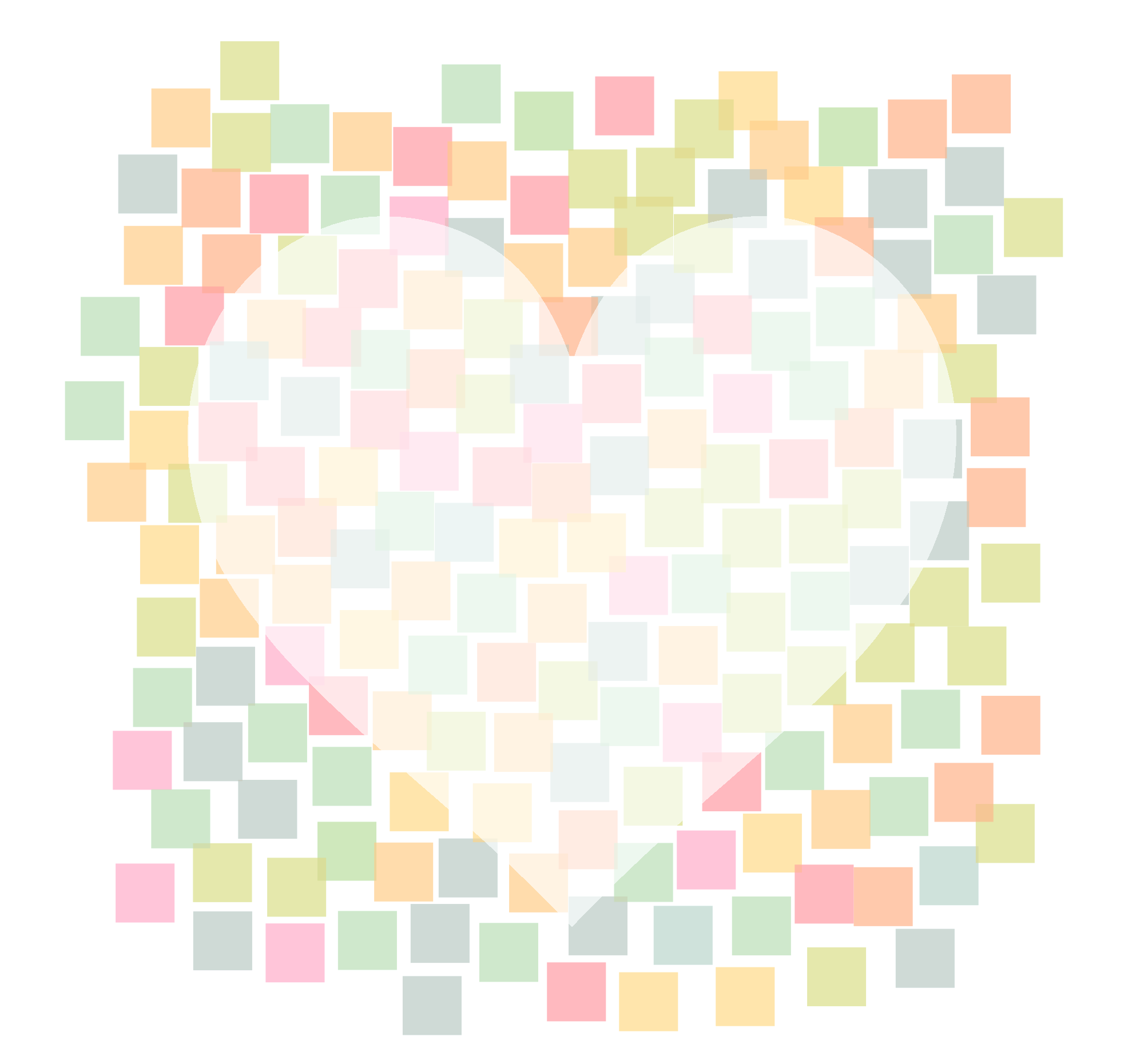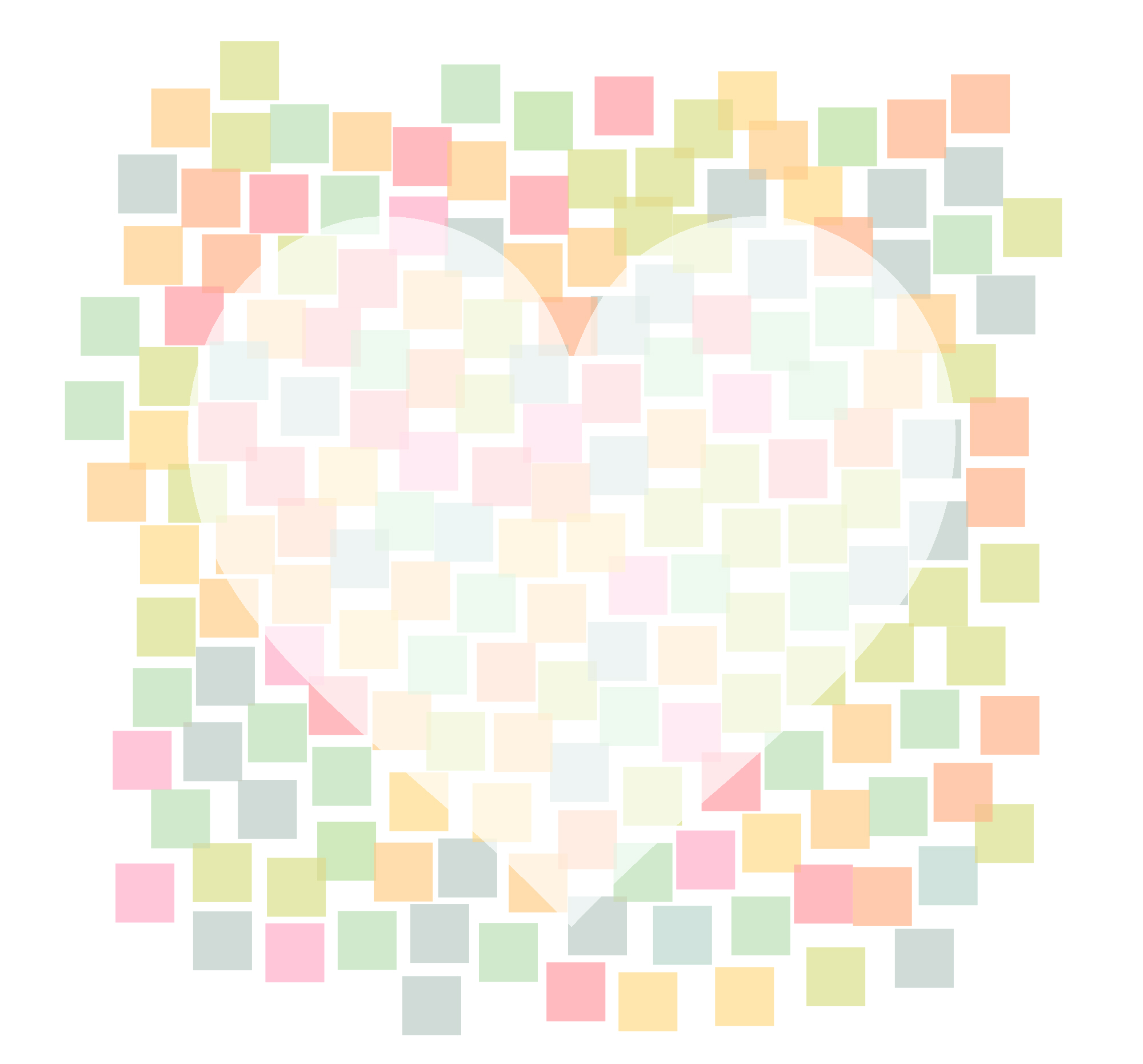 ランダムに並んだカラフルなブロック模様に、白っぽくハートが透けている素材です。png素材では、全体的に透明感があり、ハート部分はほとんど着色されていない感じです。