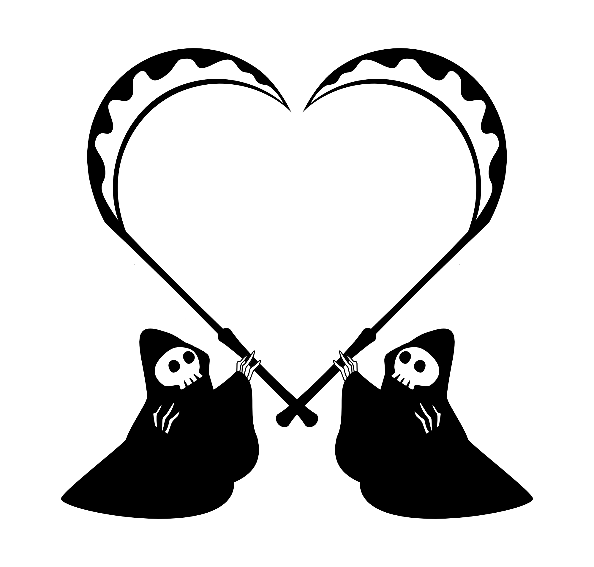 死神が鎌を合わせて、ハートを形作っているハロウィン風のイラスト素材です。下記からサイズ大きめの画像と、文字なしバージョン、文字のみバージョンのファイルがダウンロードできます。
