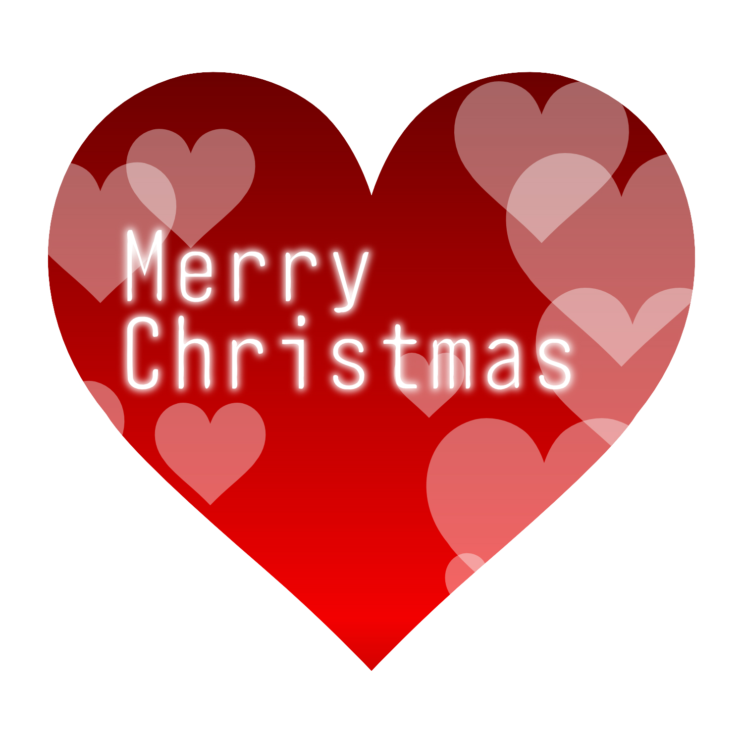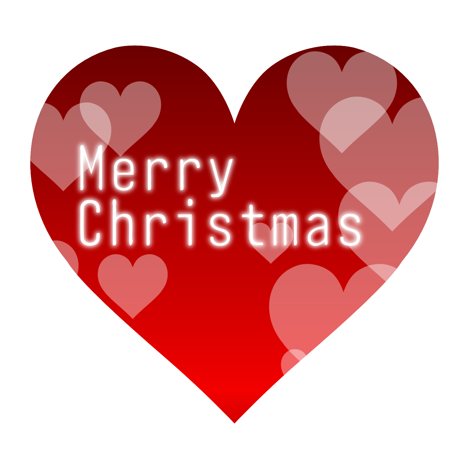 クリスマスをイメージした、真っ赤なハートマークのイラスト素材です。中心のハートにはメリークリスマスのメッセージ、左右には白いハートや雪の結晶模様が入っています。